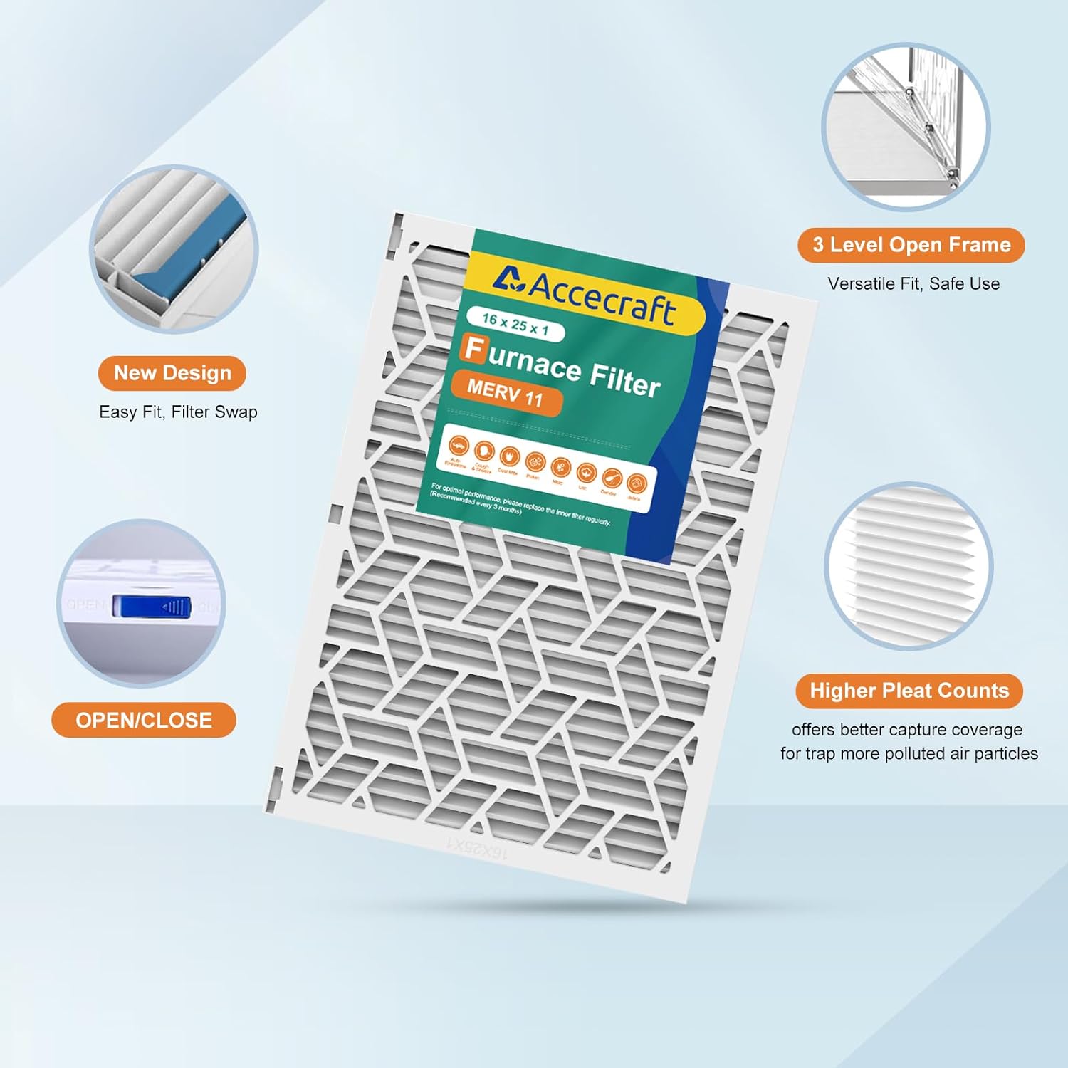 ⭐【PRODUCT DETAILS】16x25x1 MERV 11 Air Filter for Air Conditioners, Furnaces, and HVAC Systems. Comparable to MPR 1100 / FPR 7. Accecraft furnance filter is a cost-effective and practical reusable furnace filter.(Include:1 Reusable ABS Frame + 6 Pack Replaceable Quality Furnace Filter Media)Replace every 60-90 days for optimal performance.(Actual Size: 15.63x24.72x0.87 Inch)