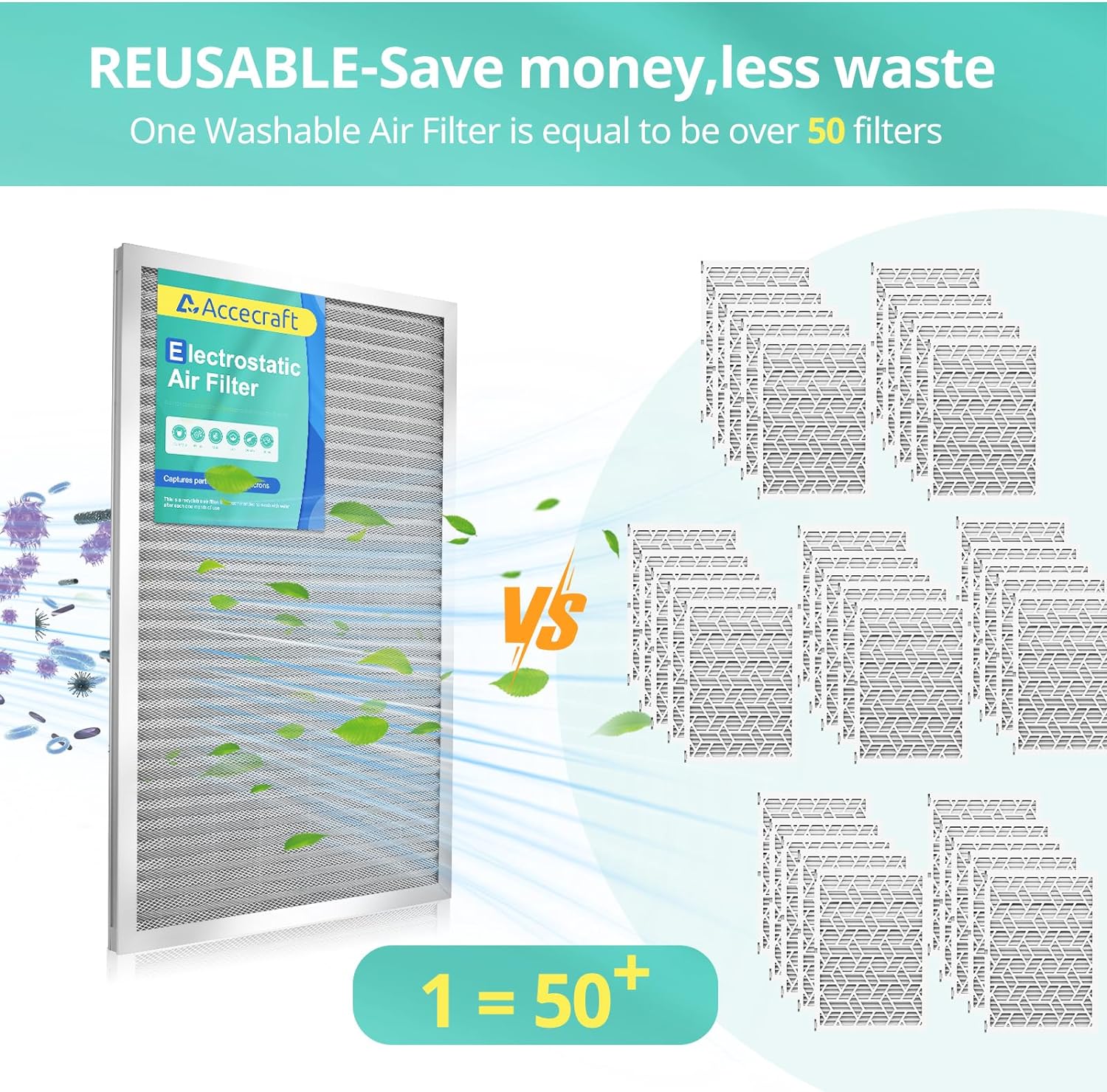 【Save Money&Less Waste】 Accecraft electrostatic air filter is built to last. Crafted with an aluminum frame, it possesses the resilience to endure robust winds without undergoing deformation or breakage. By using a filter that can be cleaned and reused, you are not only avoiding wasting resources and causing environmental pollution but also reducing your overall cost of use.