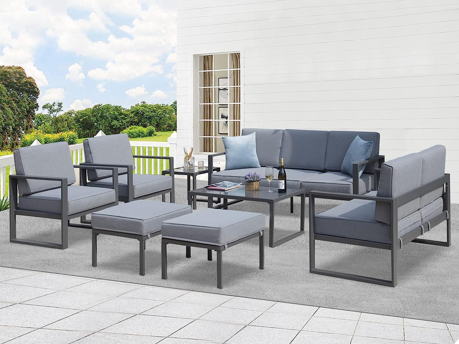 INCLUDING- This aluminum patio furniture set includes: 2 x armchairs, 1 x loveseat, 1 x 3-seat sofa, 1 x coffee table, 1 x end table, and 2 x ottomans. Every moment spent on this set is going to be worth it